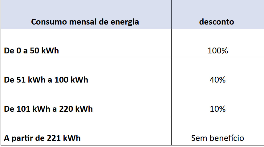 Os descontos da Tarifa Social de Energia Elétrica variam de 10% a 65%, de acordo com a faixa de consumo: