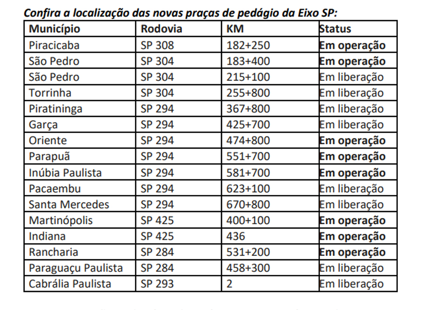 De acordo com a concessionária que administra a rodovia, ainda não há previsão para o início das operações das praças de pedágio de Piratininga e Garça (SP) na rodovia (111 km de Ourinhos). Confira abaixo as novas tarifas cobradas dos motoristas no trecho: