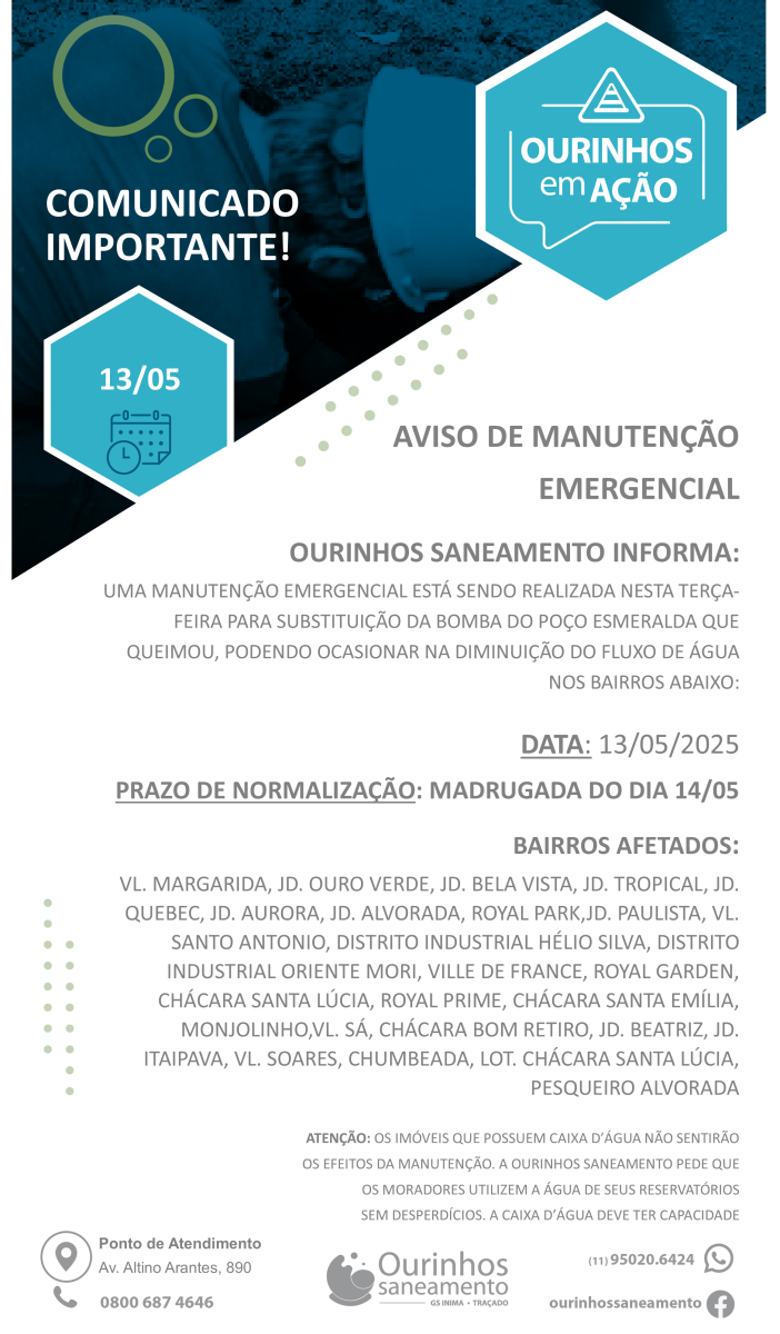 A Ourinhos Saneamento, concessionária responsável pelos serviços de água e esgoto na cidade, divulgou na tarde desta terça-feira, 13 de maio de 2025, um comunicado informando sobre uma manutenção emergencial no Poço Esmeralda, que teve sua bomba queimada e precisou ser substituída com urgência.
