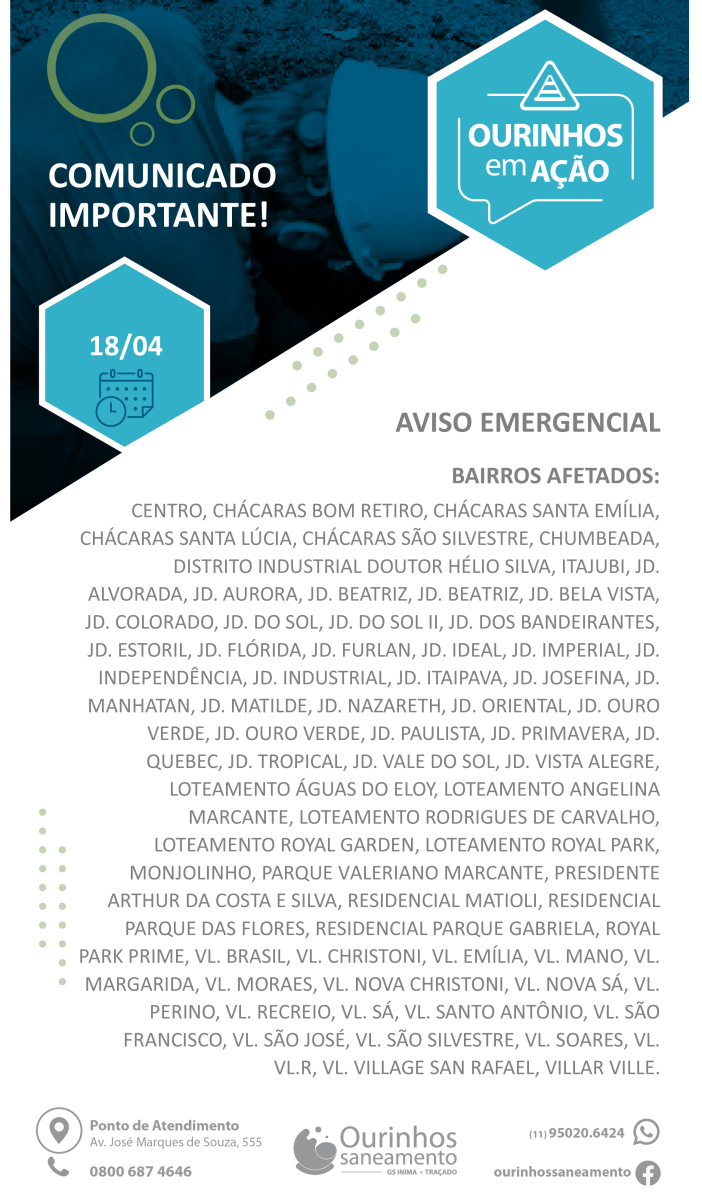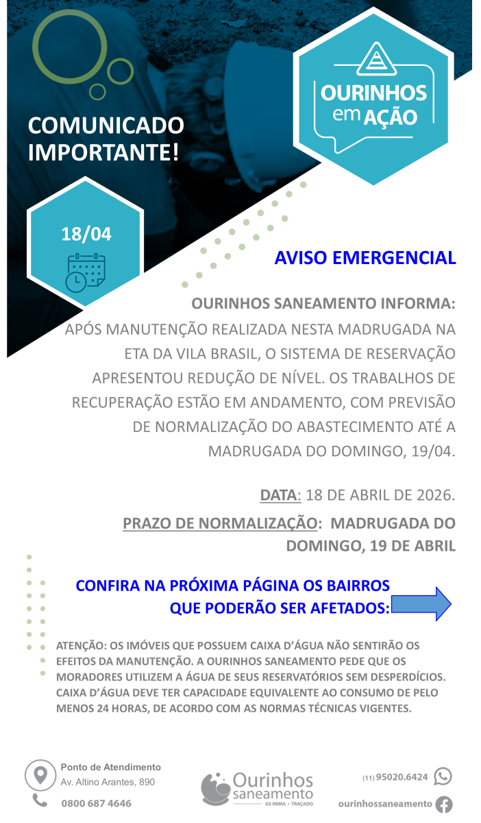 A concessionária Ourinhos Saneamento emitiu um comunicado emergencial neste sábado, 18 de abril, alertando a população sobre possíveis interrupções no abastecimento de água em diversos bairros da cidade.