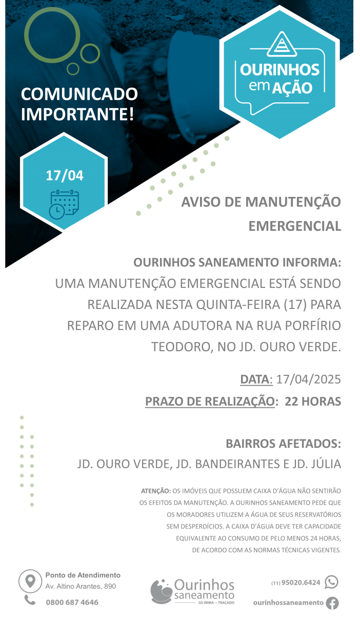 Mais informações estão disponíveis no site oficial da empresa (www.ourinhossaneamento.com.br) ou por meio dos canais de atendimento: 0800 687 4646 e WhatsApp (11) 95020-6424.