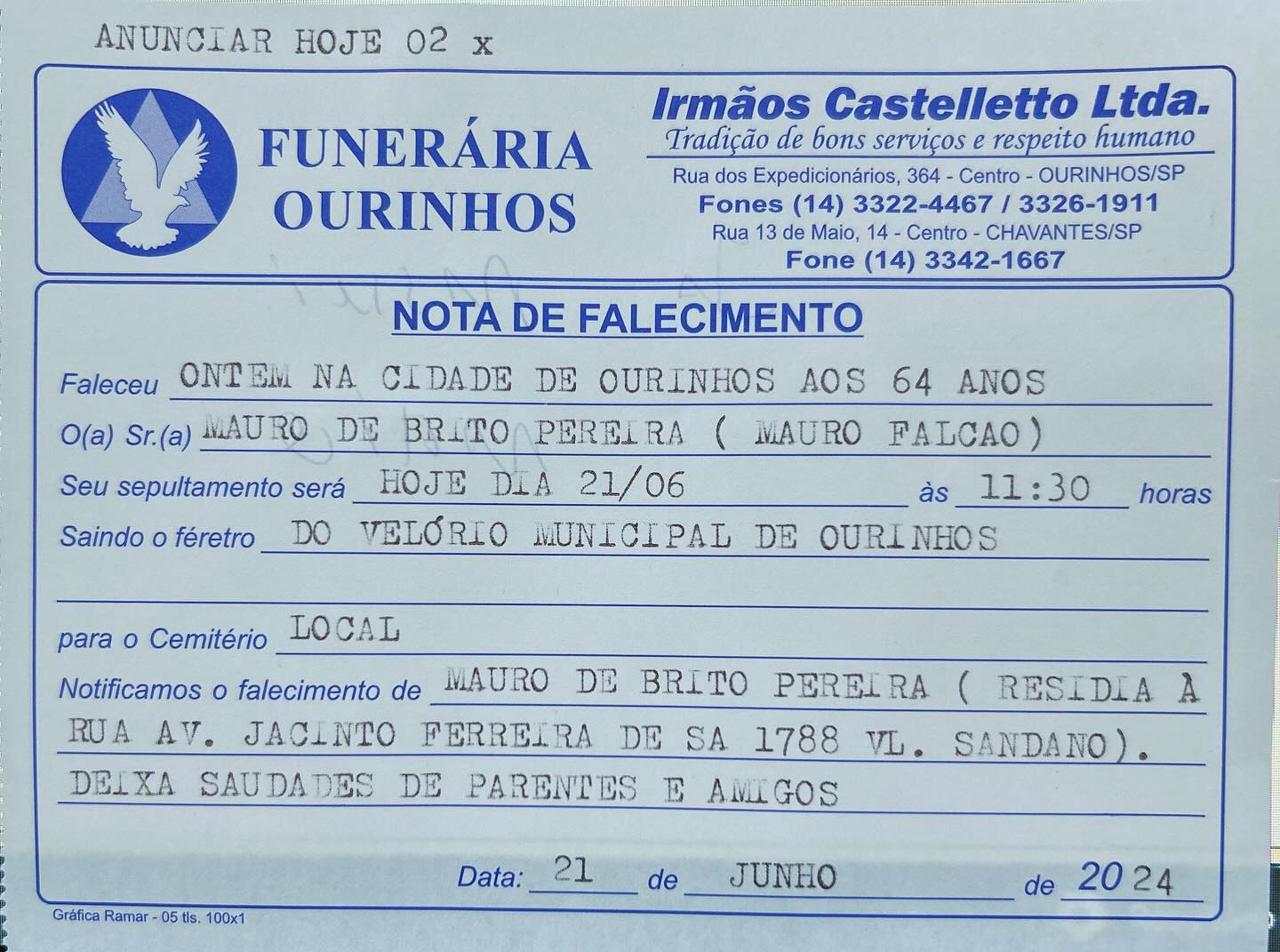Mauro de Brito Pereira, servidor público municipal aposentado e conhecido carinhosamente como "Mauro Falcão", faleceu nesta quinta-feira aos 64 anos. O velório será realizado amanhã (21) das 8h às 11h30 no Velório Municipal de Ourinhos, seguido pelo sepultamento às 11h30 no Cemitério Municipal de Ourinhos.