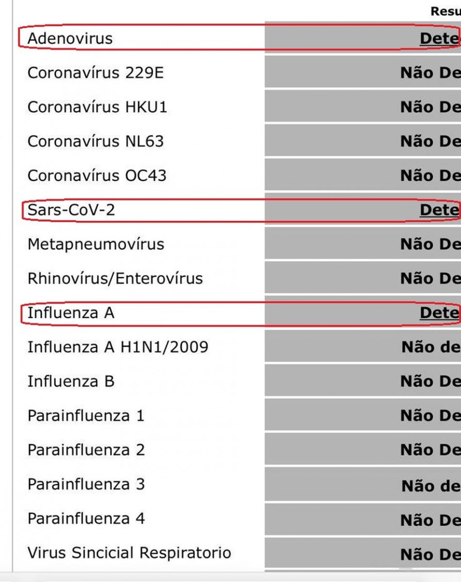 Segundo Naime, o exame apontou a presença do vírus da Sars-Cov-2 (causador da Covid-19), o da Influenza A (provavelmente o da H3N2) e de um adenovírus, responsável pelos resfriados comuns. O exame não inclui o sequenciamento genético para o vírus da Covid, mas o médico diz que possivelmente é a variante ômicron.