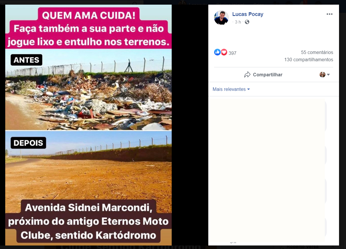 Depois do Passando a Régua fazer matéria (clique aqui e relembre) no último dia 8 de julho, na antiga estrada da Guaraiuva, ao lado do aeroporto de Ourinhos, denunciando a queimada e o lixão a céu aberto, a Prefeitura de Ourinhos finalmente limpou a área. A limpeza rendeu até uma postagem na página oficial do prefeito de Ourinhos, Lucas Pocay (PSD) (confira abaixo). Esperamos que o mesmo aconteça com a Rua Laerte Rosa Bulqui, no Jardim Idea, antes que o contrato de apenas dois meses pela fortuna de mais R$190,6 mil termine.