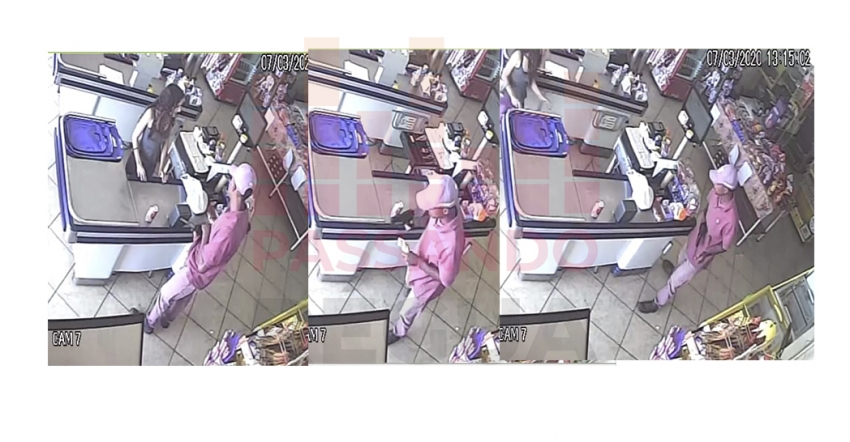 O homem aparece nas imagens usando uma pistola de brinquedo e assaltando o caixa do mercado (Veja o vídeo abaixo).