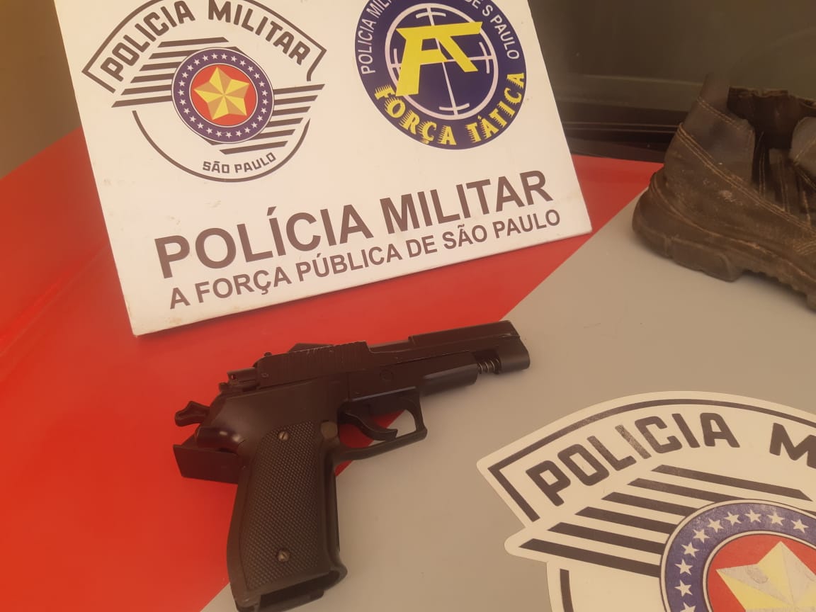 Realizada busca pessoal, nada ilícito foi localizado com acusado, que ao ser indagado sobre o roubo, este veio a negar a autoria, porém, ao tomar conhecimento que havia filmagens no local, confessou o roubo e indicou um simulacro de arma de fogo (pistola), que foi utilizado no crime, o qual havia escondido sob alguns entulhos. Ainda na residência foi localizado a calça jeans e a bota que foi utilizada no dia dos fatos.