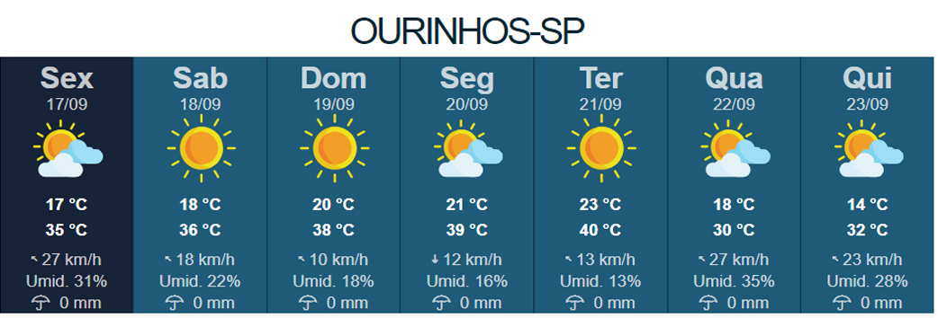 Segundo dados do Instituto de Pesquisas Meteorológicas da Unesp de Bauru, a temperatura já começa a subir neste sábado (18), que deve registrar máxima na casa dos 36°C e pode chegar a 40°C na terça-feira (21).