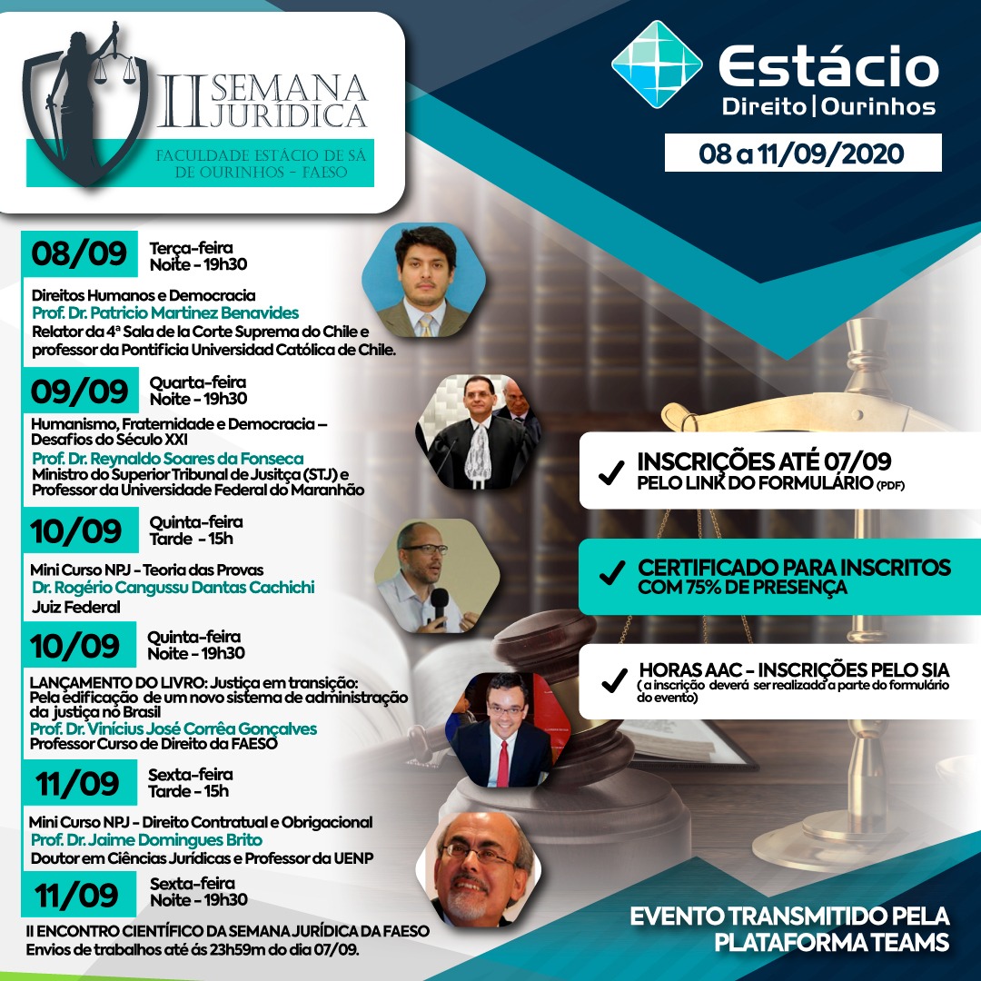 A Estácio Ourinhos está realizando virtualmente a II Semana Jurídica e o II Encontro Científico. O evento gratuito, que começou nesta terça-feira, 8, e vai até a próxima sexta-feira, 11, e aberto ao público, está sendo transmitido pela plataforma Teams. Todos os inscritos que tiverem mais de 75% de presença terão direito ao certificado de participação e, especificamente os alunos de Direito, créditos adicionais em horas de atividades acadêmicas complementares.