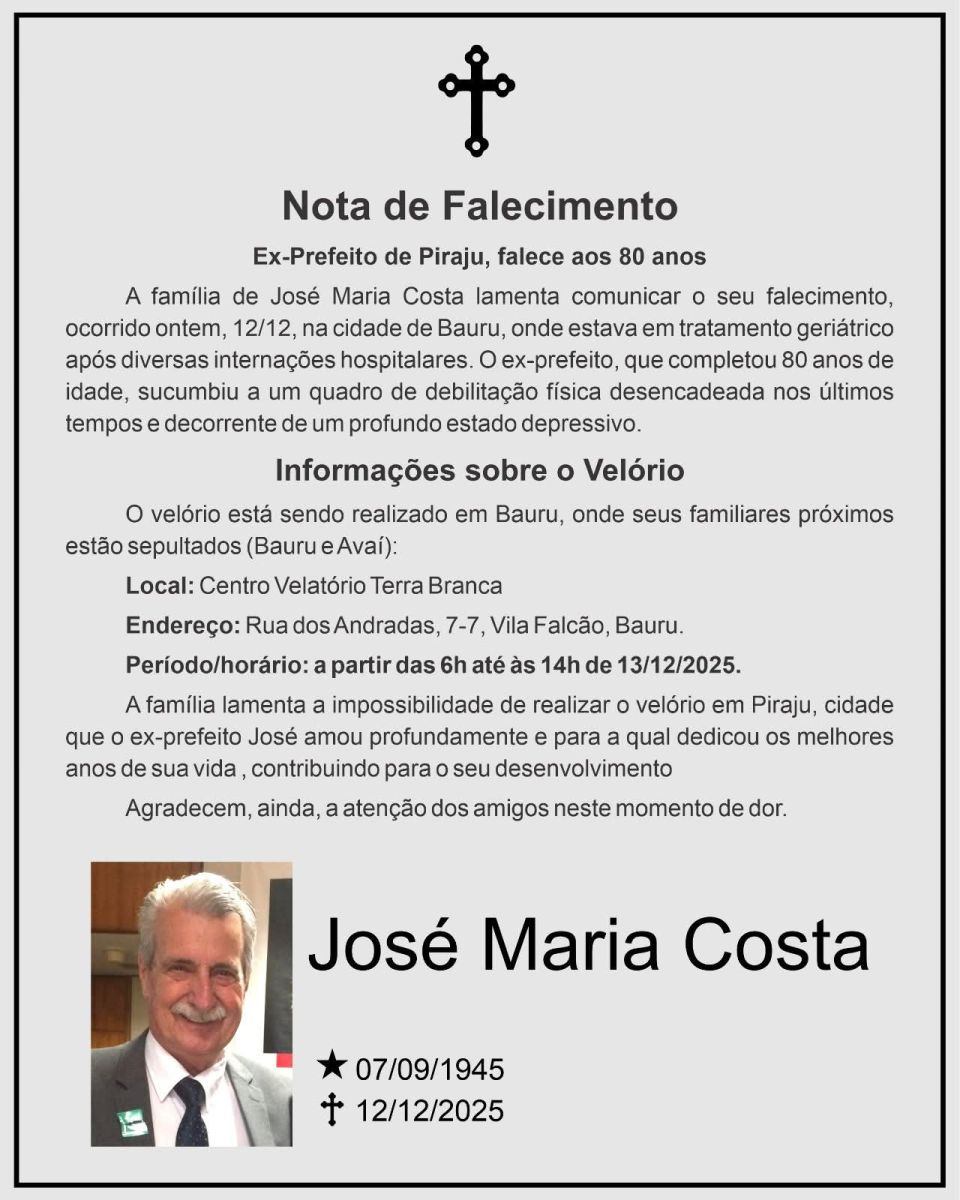 Faleceu na noite desta sexta-feira, 12 de dezembro, o ex-prefeito de Piraju (SP), José Maria Costa, popularmente conhecido como Zé Maria, aos 80 anos. A informação foi confirmada pela imprensa local e gerou comoção na comunidade.