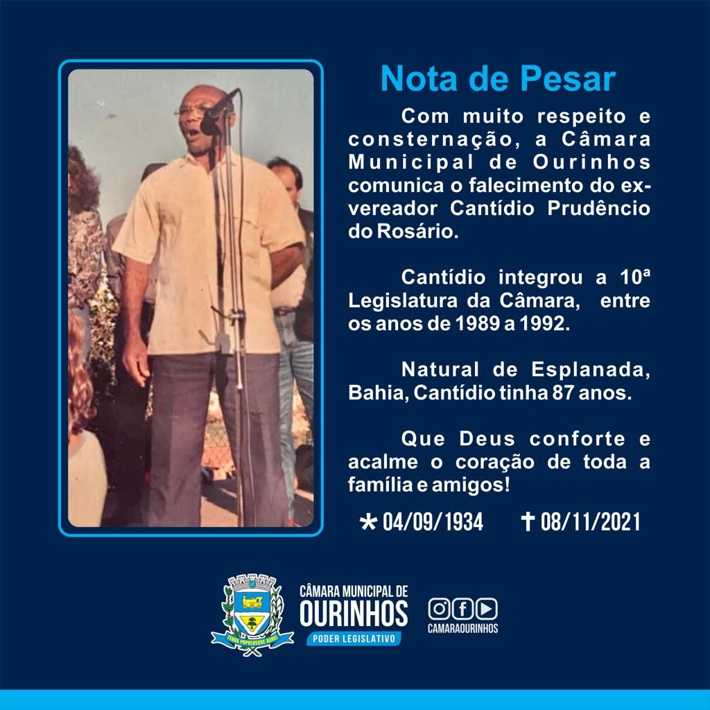 Faleceu nesta segunda-feira, 8, aos 87 anos, o senhor Cantídio Prudêncio do Rosário, ex-vereador de Ourinhos. Cantídio integrou a 10ª Legislatura da Câmara, entre os anos de 1989 a 1992. Natural de Esplanada, Bahia, Cantídio foi sepultado na tarde de hoje, por volta das 16h, no Cemitério Municipal de Ourinhos. Que Deus conforte e acalme o coração de toda a família e amigos!