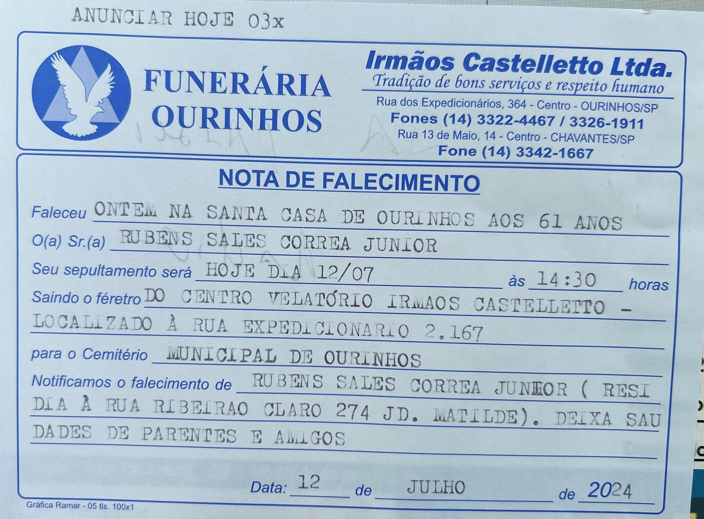 Outra triste notícia é o falecimento de Rubens Sales Correa Junior, aos 61 anos. Rubens está sendo velado no Centro Velatório Irmãos Castelletto e seu sepultamento ocorrerá hoje, às 14h30, no Cemitério Municipal de Ourinhos.