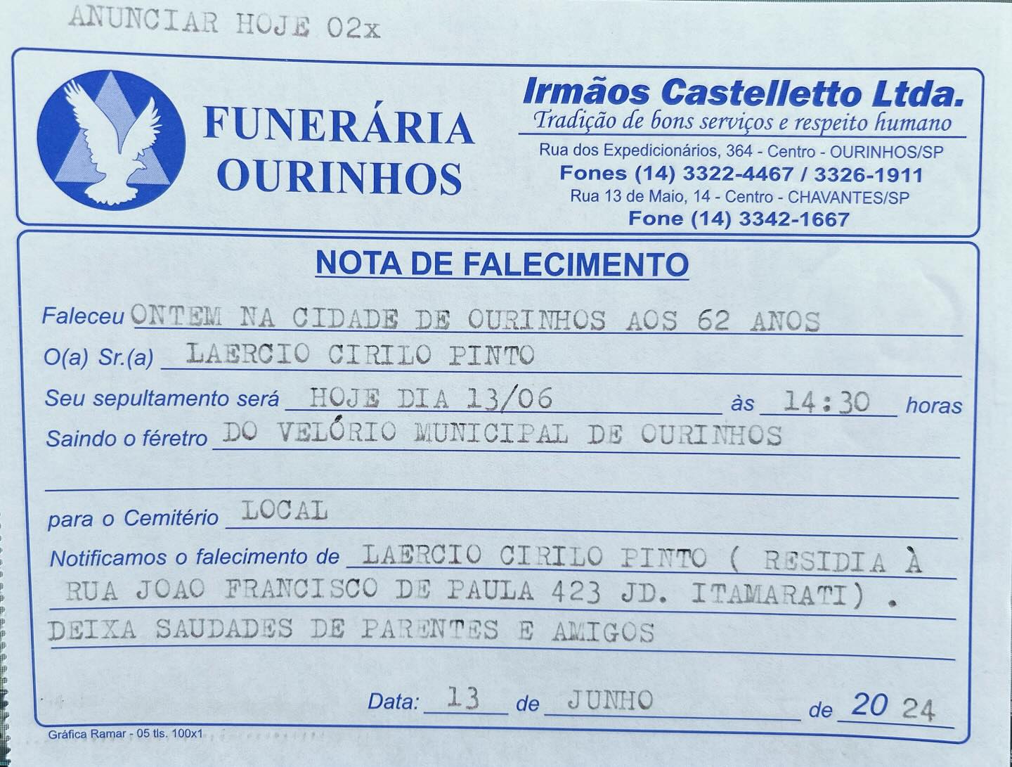 Laércio Cirilo Pinto, de 62 anos, faleceu nesta quarta-feira, 12 de junho, em Ourinhos. Seu velório está ocorrendo no Velório Municipal de Ourinhos. O sepultamento será realizado hoje, às 14h30, no Cemitério Municipal de Ourinhos.