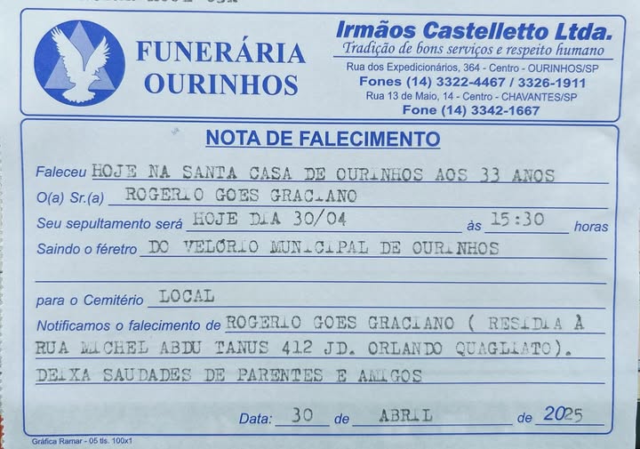 Faleceu nesta quarta-feira (30), em Ourinhos, o jovem Rogério Góes Graciano, aos 33 anos. Ele estava internado devido a uma infecção e não resistiu. O velório acontece no Velório Municipal de Ourinhos e o sepultamento está marcado para as 15h30, no Cemitério Municipal.