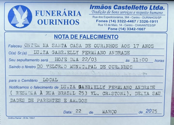 A jovem Luiza Gabrielly Fermiano Andrade, de 17 anos, moradora da região da Barra Funda, em Ourinhos (SP), faleceu na noite desta sexta-feira (21). Ela estava internada na Santa Casa de Misericórdia de Ourinhos e seu estado de saúde mobilizou familiares e amigos, que organizaram uma corrente de oração pela sua recuperação.