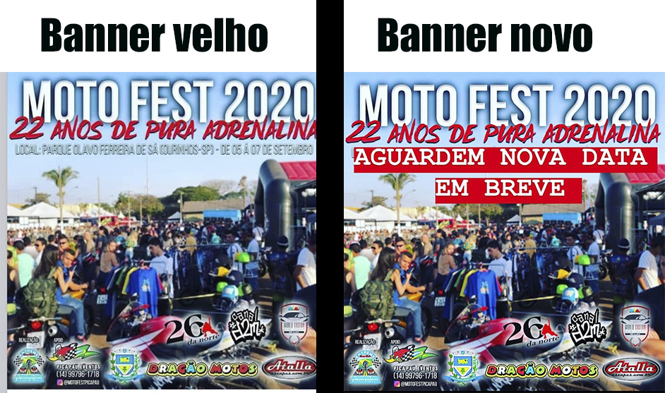 Circula nas redes sociais um banner de divulgação do Moto Fest 2020, que de início estava marcado para acontecer de 5 a 7 de setembro, porém, de acordo com o organizador do evento, presidente da Extreme Motor Clube, senhor Reinaldo Gaiguer “Pica-pau”, o evento foi adiado e ainda não há uma data estabelecida para acontecer.
