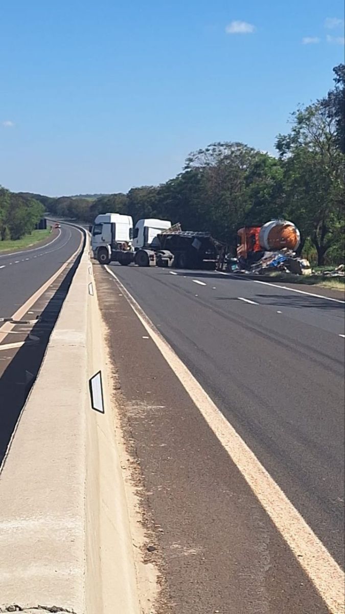 Na sequência, um segundo caminhão, que transportava gás, também tentou evitar a colisão e saiu para o acostamento pela direita. Porém, um terceiro caminhão, carregado com pisos de cerâmica, também desviou para a direita, mas acabou batendo contra uma árvore e, em seguida, colidindo com o caminhão de gás, o que causou um vazamento no local e interditou completamente a rodovia.