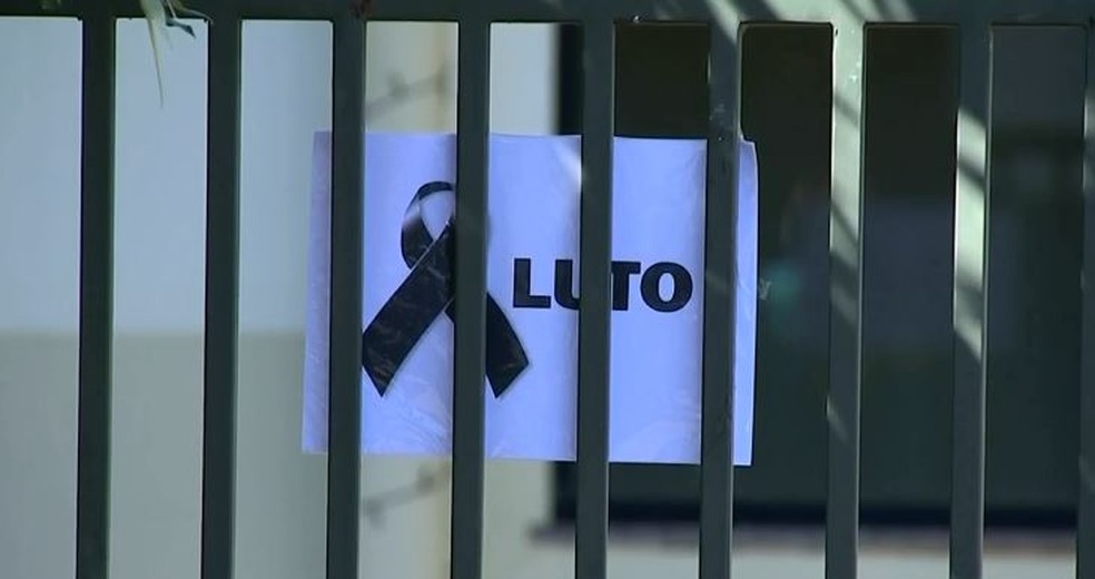 A escola em que as crianças estudavam colocou um comunicado de luto na porta da unidade (Foto: TV TEM/Reprodução)