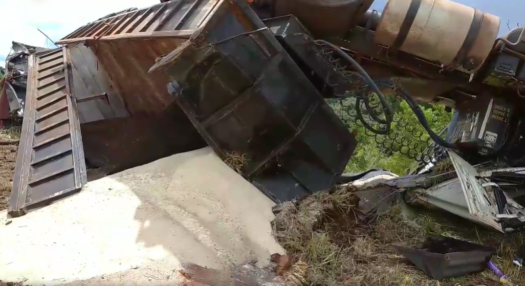 Caminhão ficou todo destruído e carga às margens da vinicinal (Foto: Reprodução/ Alexandre Mansinho -Metropolitana TV WEB)