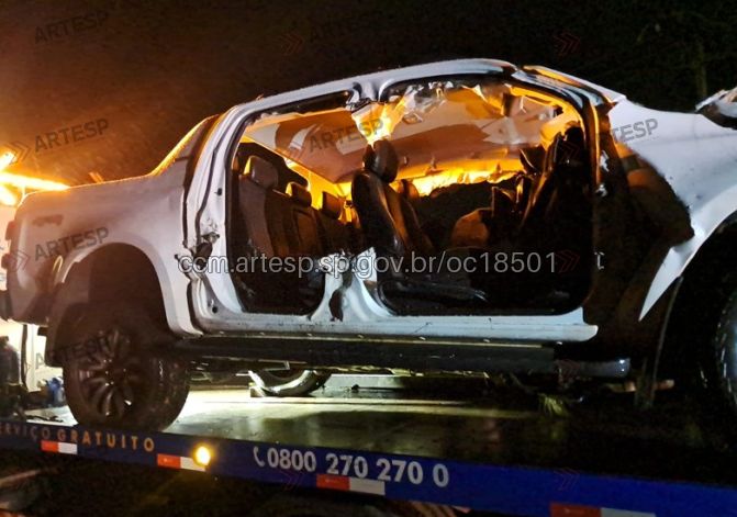 Imagens registradas pela concessionária responsável pelo trecho mostram que a caminhonete branca ficou completamente destruída após a colisão. Já o motorista da carreta não sofreu ferimentos.