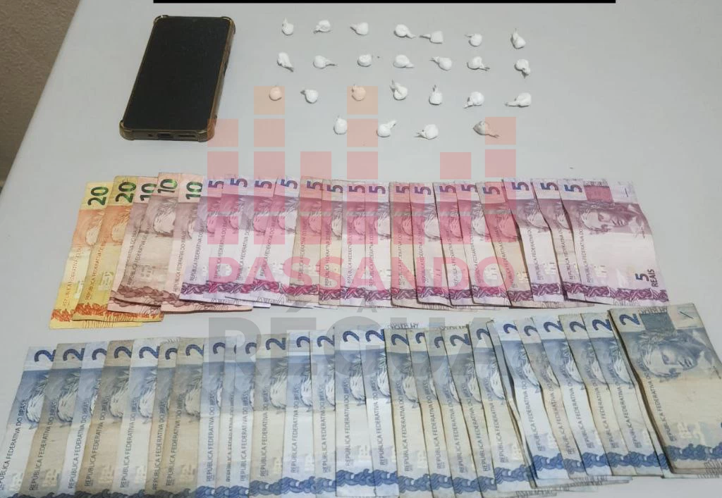 Durante a busca pessoal, nada de ilícito foi encontrado. No entanto, ao revistar os pertences do mototaxista, os policiais localizaram um invólucro de tecido azul dentro de sua bolsa, contendo 24 porções de cocaína, além de um celular da marca Redmi e R$ 226,00 em dinheiro. Uma segunda porção da mesma droga foi encontrada em uma bolsa preta acoplada à lateral da motocicleta.