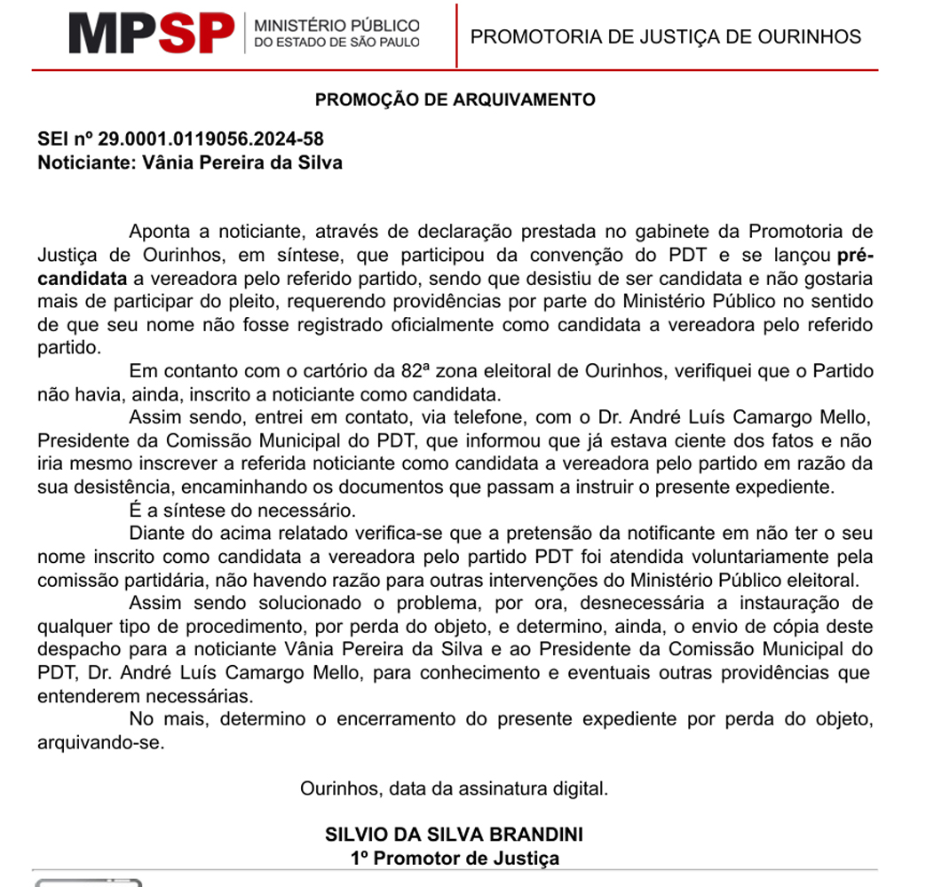 Nesta terça-feira, 30, o 1º Promotor de Justiça de Ourinhos, Silvio da Silva Brandini, determinou o encerramento e arquivamento das investigações relacionadas à denúncia apresentada por Vânia Pereira da Silva. Vânia alegou que sua pré-candidatura para vereadora foi registrada sem seu consentimento, um caso que veio à tona na última sexta-feira, 26, quando ela formalizou a denúncia na 4ª Promotoria de Justiça de Ourinhos, perante o promotor substituto Lúcio Camargo de Ramos Junior.