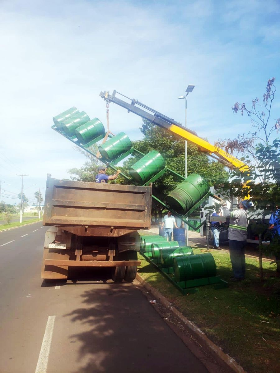 Caminhão placa CZA-4412, da frota municipal da prefeitura, transportou a estrutura para ser instalada no lago