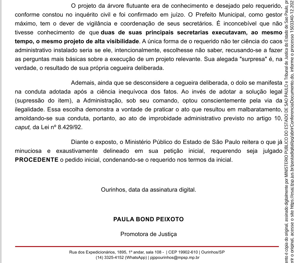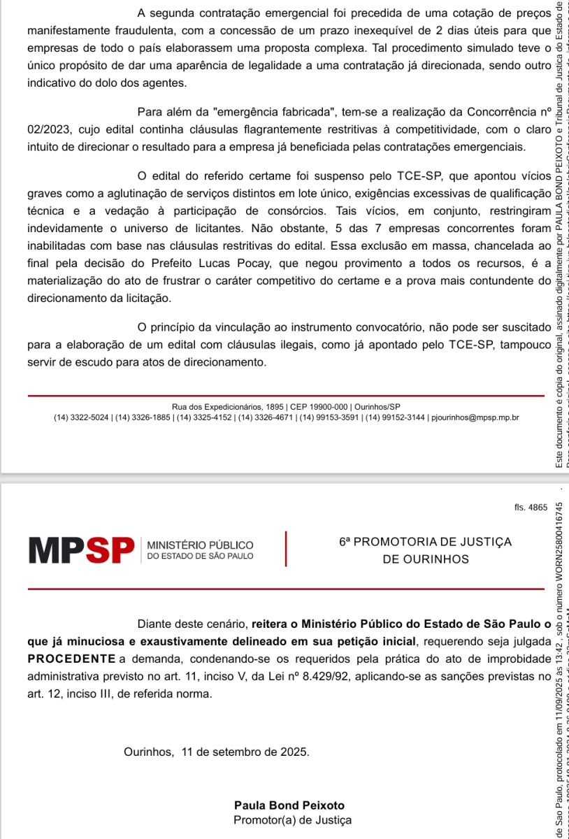 As duas ações agora aguardam análise pela Justiça de Ourinhos. Caso sejam julgadas procedentes, o ex-prefeito Lucas Pocay poderá ser condenado às sanções previstas na Lei de Improbidade Administrativa, que incluem perda de direitos políticos, proibição de contratar com o poder público e ressarcimento ao erário.