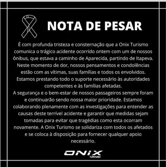 Ao g1, a Onix, empresa responsável pelo ônibus, informou que o motorista é funcionário da empresa. Também disse que o ônibus tem capacidade para 54 pessoas e foi fretado para realizar a viagem até Aparecida, saindo de Itapeva. Além disso, informou que está aguardar laudos técnicos que devem confirmar a dinâmica do acidente.