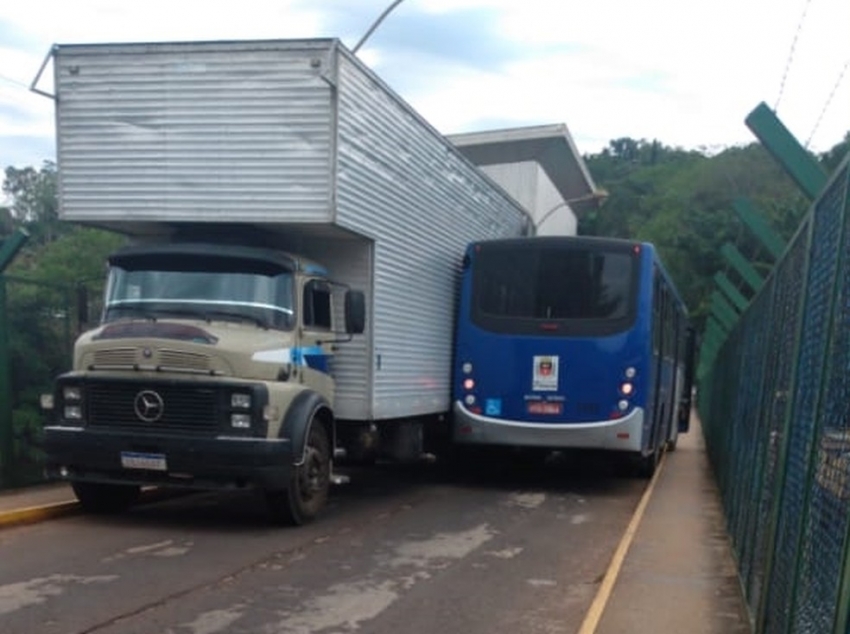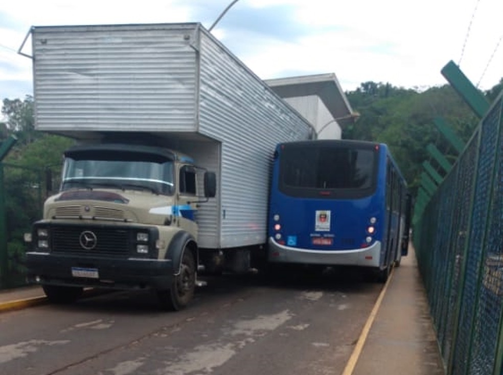 Um ônibus e um caminhão ficaram entalados na Ponte Engenheiro Nelson Godoi, em Piraju (SP) (60 km de Ourinhos), nesta quinta-feira (29).