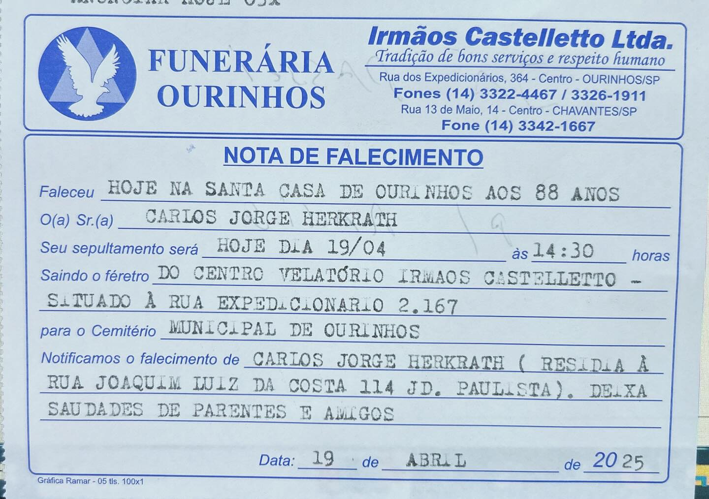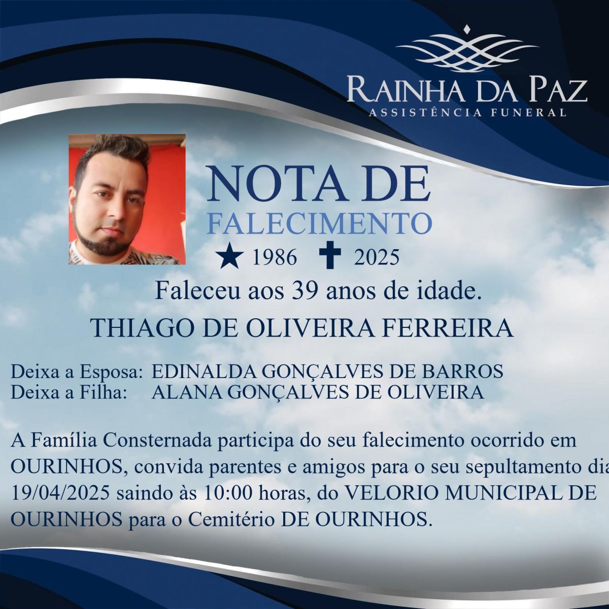 O sepultamento de Thiago está marcado para a manhã deste sábado (19), saindo do Velório Municipal de Ourinhos às 10h para o Cemitério Municipal.