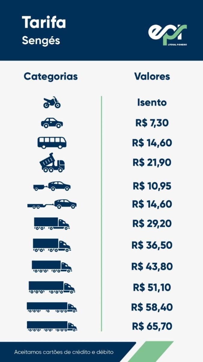 Neste sábado, 01 de março, começou a operação assistida, fase de testes da concessionária, em que os usuários que passarem pelas praças receberão orientações sobre a nova estrutura. Neste período não haverá cobrança. Os valores das tarifas para as diferentes categorias estão anexo.