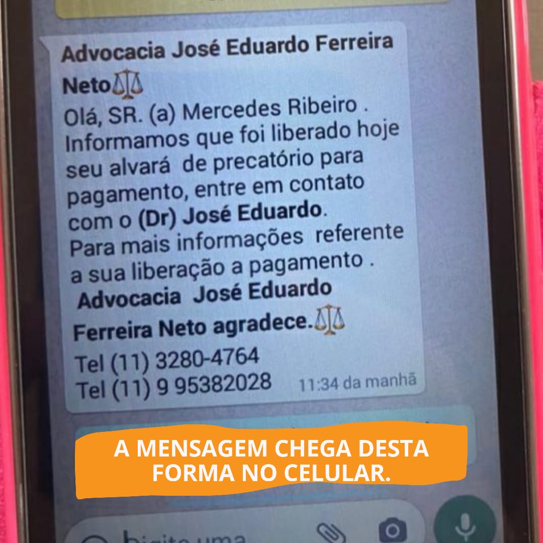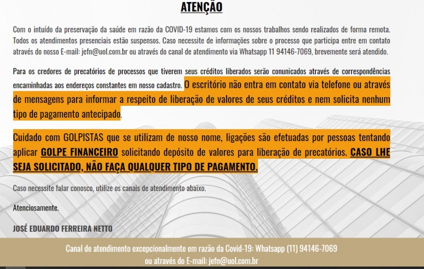 A Diretoria da 58ª Subseção da OAB de Ourinhos, através de seu Presidente Dr. Fernando Alves de Moura, informa que GOLPISTAS estão utilizando indevidamente o nome do advogado, Dr. José Eduardo Ferreira Neto e através de ligações aplicando GOLPE FINANCEIRO, ou seja, solicitando depósitos de valores para a liberação de precatórios, conforme especificado na imagem em anexo. Diante do fato, pede-se que fiquem atentos e ainda, que se caso isso acontecer, não efetuem qualquer tipo de pagamento e muito menos retornem as ligações. Para eventuais dúvidas ou esclarecimentos basta ligar no (14) 3322-5161.