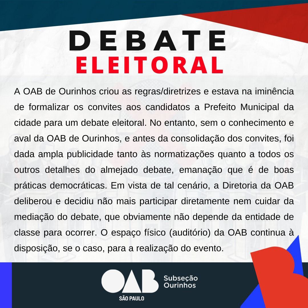 Na nota enviada ao site, o presidente da OAB de Ourinhos, Dr. Daniel Marques de Camargo, que atuaria como mediador do debate, explicou que a divulgação do evento ocorreu antes da consolidação dos convites aos quatro candidatos: Caio Lima (PSD), Guilherme Gonçalves (Podemos), Mario Ferreira (REDE), e Toninho do PT. A OAB ressaltou que, apesar de não mais participar diretamente do evento ou cuidar de sua mediação, o espaço físico da OAB, incluindo o auditório, permanece à disposição para a realização do debate, caso os outros organizadores decidam prosseguir.