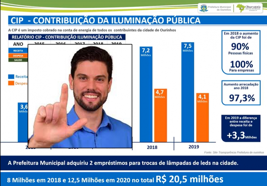 De acordo o gráfico publicado, no governo de Lucas Pocay (PSD) houve o aumento de quase 100% na arrecadação com a CIP, graças aos reajustes feitos pelo prefeito no início do mandato na tabela, em cerca de 45%, chegando em alguns casos aumentar até 70% da taxa que é paga pelos munícipes na conta de energia elétrica. (Veja o vídeo abaixo no fim da matéria).
