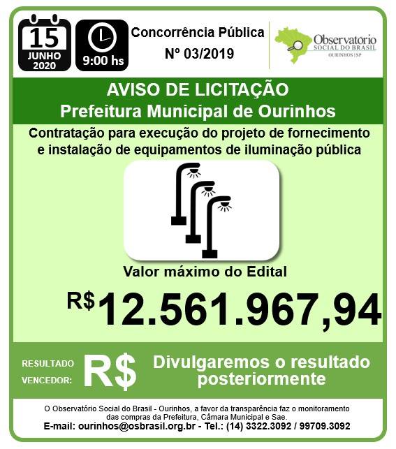 A Prefeitura de Ourinhos já publicou um edital para contratação de empresa que será a responsável pela a troca das lâmpadas, com o custo máximo do pregão de mais de R$12,5 milhões (veja a imagem abaixo).