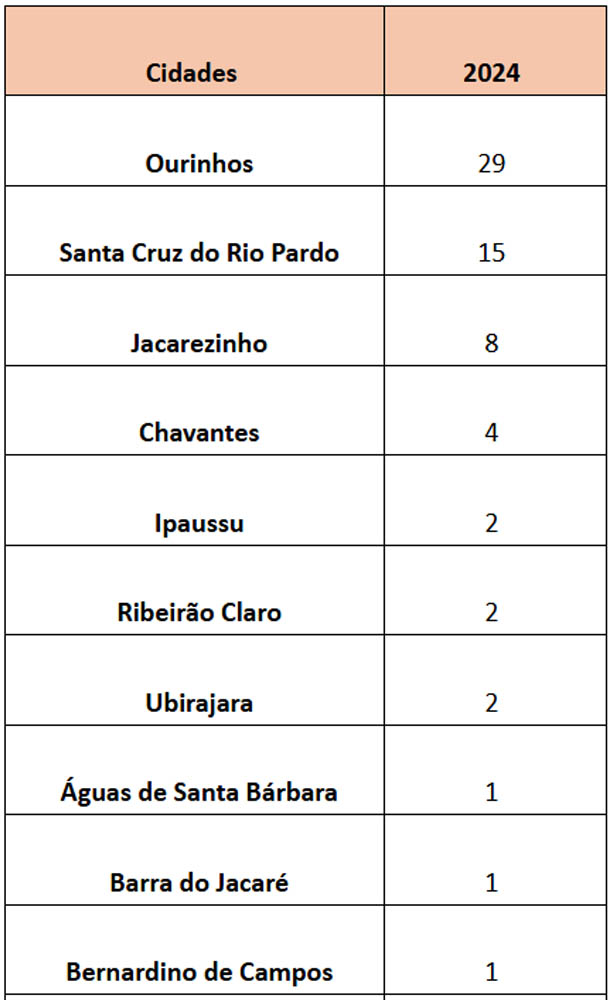Em toda a região de Ourinhos, foram cerca de 69 ocorrências de falta de energia provocadas por pipas que atingiram a rede elétrica em 2024. A cidade de Ourinhos possui o maior número de ocorrências registradas, com 29, seguida de Santa Cruz do Rio Pardo, com 15 casos computados.