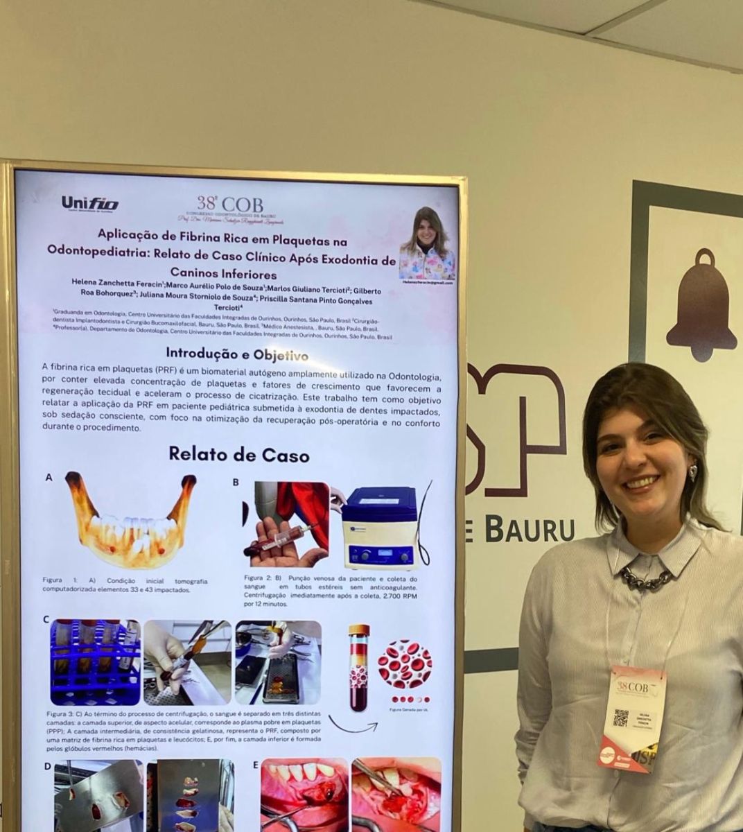 HELENA ZANCHETTA FERACIN, apresentou trabalhos com os temas: Aplicação de Fibrina Rica em Plaquetas na Odontopediatria: Relato de Caso Clínico Após Exodontia de Caninos Inferiores, tendo como orientadora Priscilla Tercioti e Abordagem multidisciplinar na reabilitação de incisivos centrais após recidiva de trauma dentário, orientadora Carolina Yoshi.