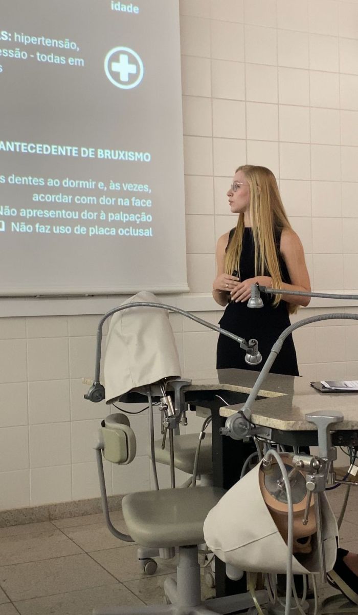 NATHÁLIA BROCHADO XIMENES, apresentou o trabalho intitulado: Reabilitação com novas próteses protocolo em paciente com desgaste e fraturas recorrentes, tendo como orientadora: Carolina Yoshi Campos Sugio.