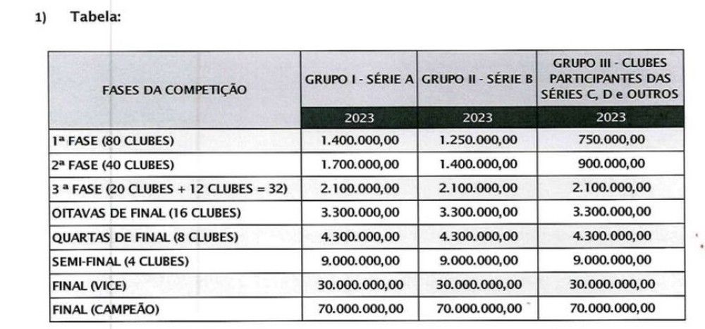 A grande novidade desta edição da Copa do Brasil é a distribuição recorde de premiação. Serão R$ 420 milhões divididos entre a primeira fase até a final. O campeão leva R$ 70 milhões e o vice R$ 30 milhões, sem contar o valor acumulado das outras fases.