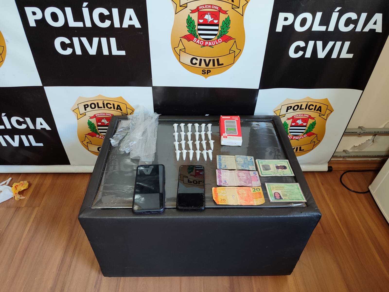 Na residência de Jeferson, o cão farejador Zara indicou o quarto do suspeito, onde foram encontrados: