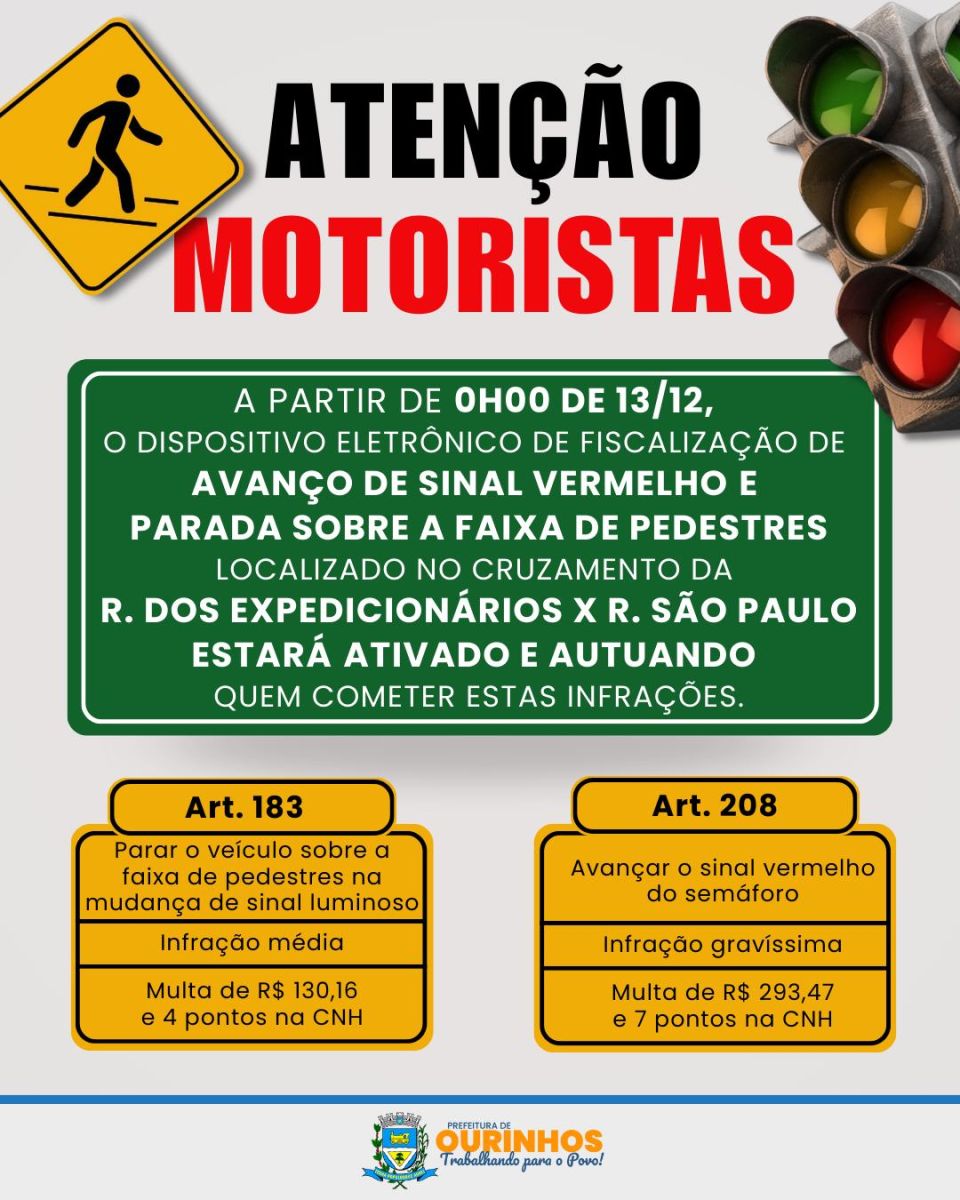 A Prefeitura de Ourinhos informou, na tarde desta quinta-feira (27), que o novo radar semafórico instalado no cruzamento da Rua do Expedicionário com a Rua São Paulo começará a autuar motoristas que desrespeitarem as regras de trânsito a partir das 0h do dia 13 de dezembro.