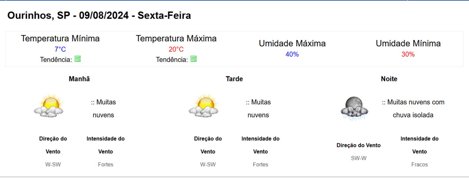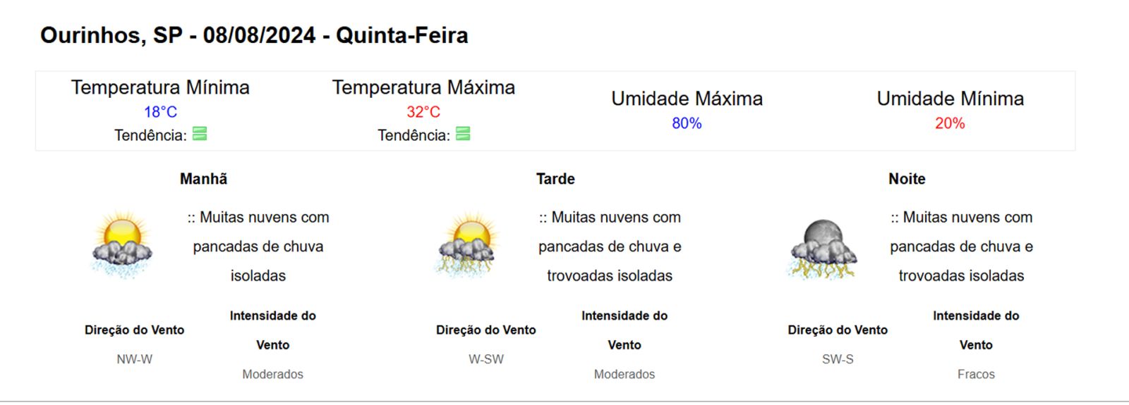 Ourinhos tem previsão máxima de 32°C para essa quinta-feira (7), mas as temperaturas devem começar a cair a partir dessa sexta-feira 9, e registrar uma mínima de até 7°C, segundo o Centro de Previsão de Tempo e Estudos Climáticos, do Instituto Nacional de Pesquisas Espaciais (CPTEC/Inpe). Tem chance de pancadas de chuva nesta quinta-feira.
