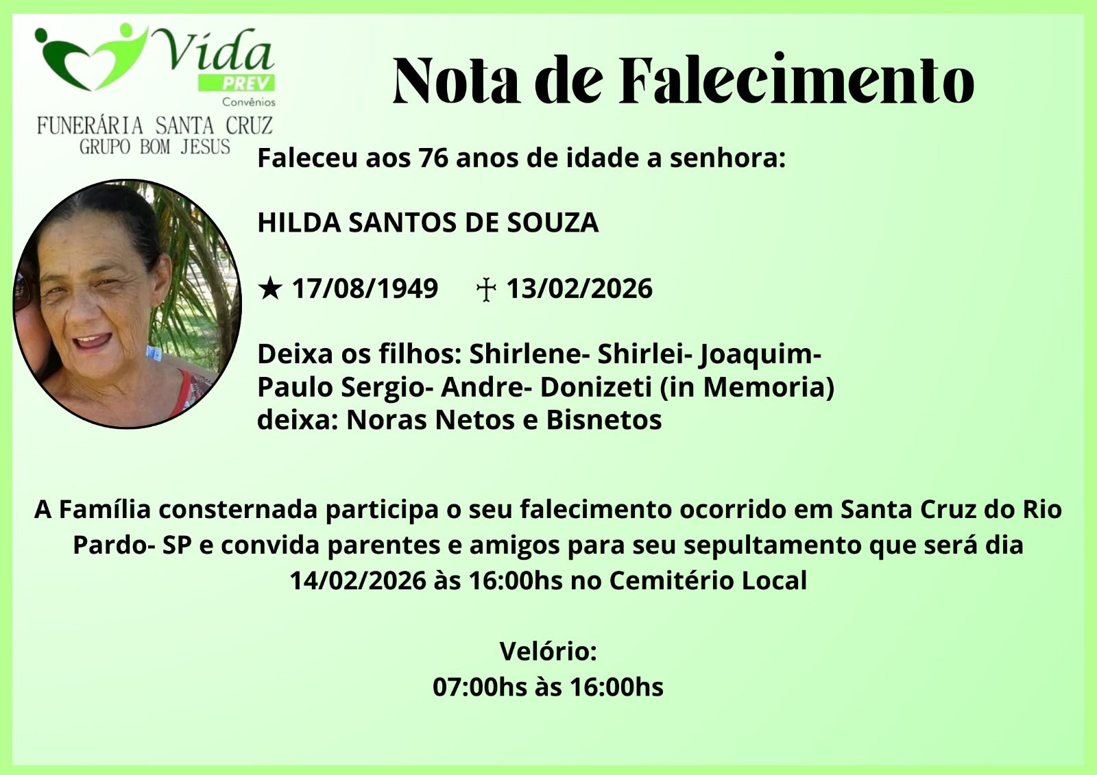 Na região, também foi registrada a morte da professora Eline Alonso Vieira, aos 83 anos, conhecida como Professora Eline Alonso. Ela faleceu na cidade de Jaú e deixa os filhos Carlos Eduardo, Domingos e Fabiana. O velório teve início neste sábado (14) na Câmara Municipal de Santa Cruz do Rio Pardo e continuará no domingo (15), a partir das 8h, na Capela da Santa Casa de Ipaussu. O sepultamento está marcado para às 13h de domingo (15), no Cemitério de Ipaussu.