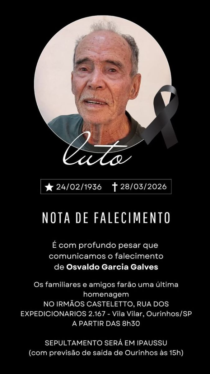 Faleceu na Santa Casa de Ourinhos o senhor Osvaldo Garcia Galves, aos 90 anos. O velório acontece no Centro Velatório Irmãos Casteletto, nas proximidades do Fórum de Ourinhos, com início às 8h30 deste sábado. O sepultamento está previsto para as 16h, no Cemitério Municipal de Ipaussu.