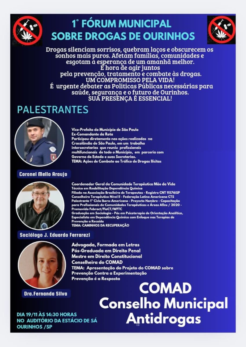 O fórum contará com a presença de autoridades e especialistas, entre eles o coronel Melo Araújo, vice-prefeito de São Paulo e ex-comandante da Rota, que abordará o tema “Ações de combate ao tráfico de drogas ilícitas”. O sociólogo J. Eduardo Ferrarezi, coordenador da Comunidade Terapêutica Mãe da Vida, apresentará a palestra “Caminhos da Recuperação”, e a advogada Fernanda Silva, conselheira do COMAD, fará a exposição “Prevenção é a Resposta”, com foco na prevenção contra a experimentação de drogas.