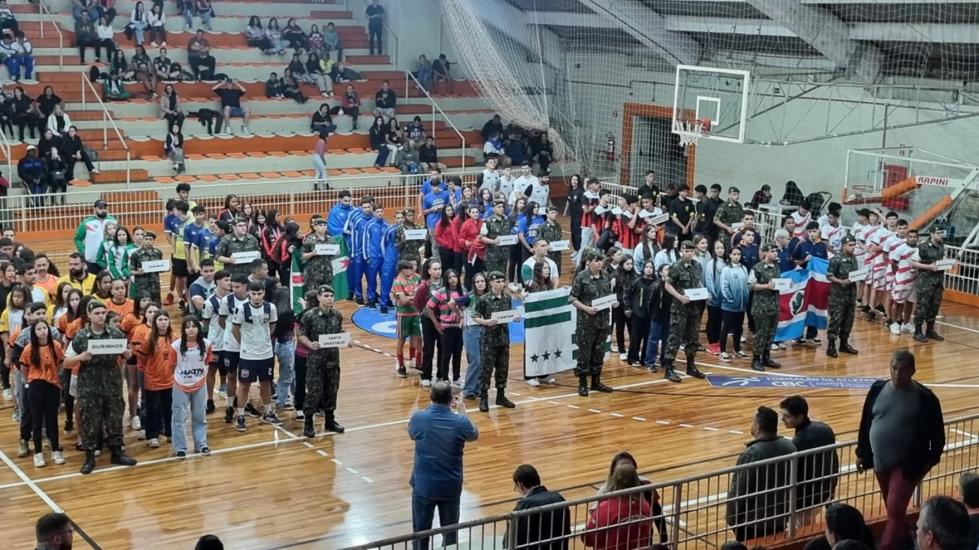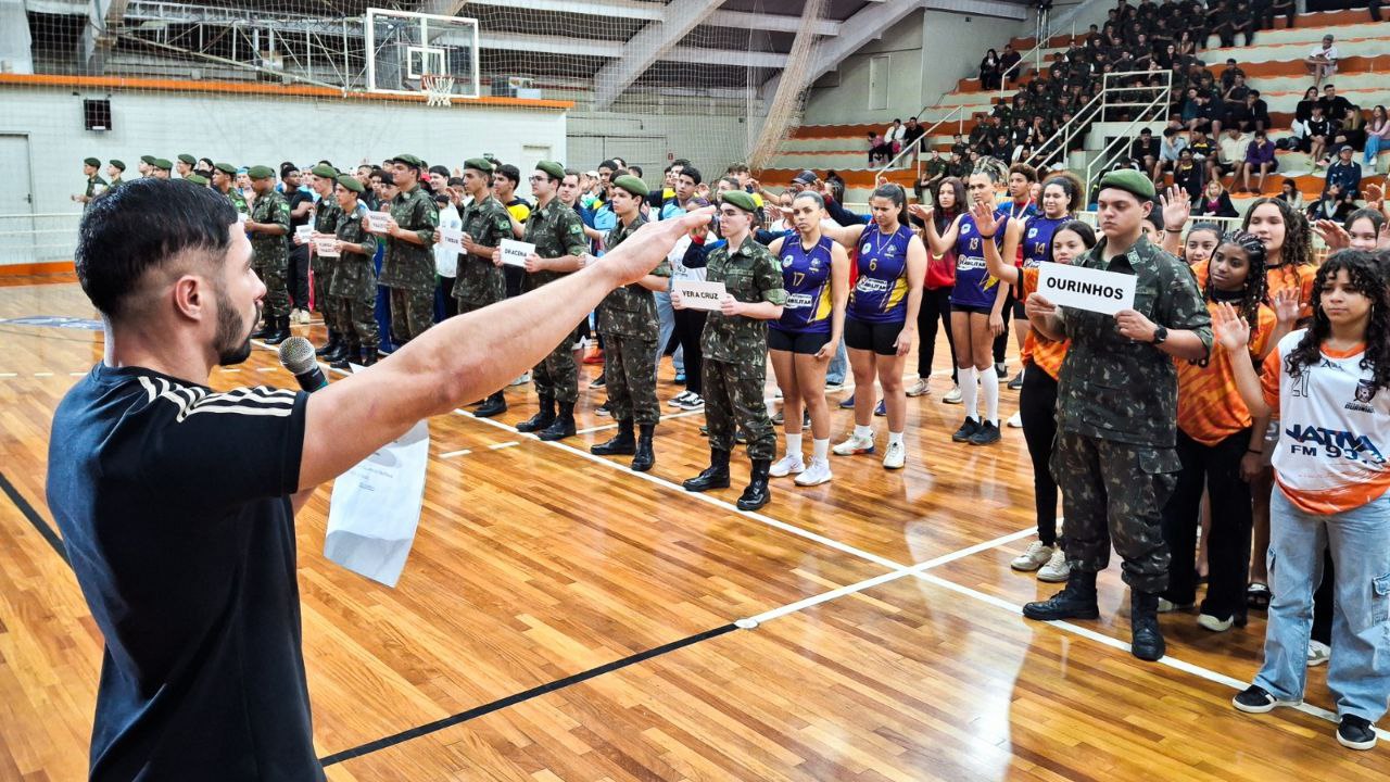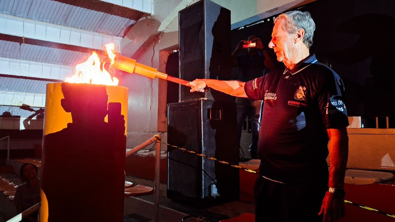 Um dos momentos mais marcantes foi a entrada simbólica da tocha olímpica, conduzida pelo professor Miguel Cury e seus filhos, em homenagem ao saudoso professor Miguel Roberto “Cury”, figura emblemática do esporte ourinhense. Comovido, o professor recebeu aplausos calorosos do público, enquanto a chama olímpica era acesa no ginásio, simbolizando o início oficial das competições.