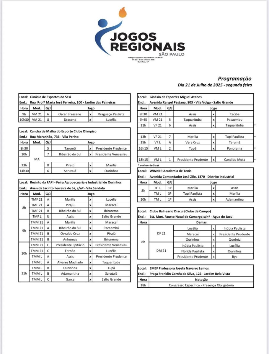 Agora oficialmente abertos, os Jogos Regionais seguem movimentando Ourinhos e Salto Grande nos próximos dias, com competições em dezenas de modalidades. Mais do que medalhas, os jogos representam a união, superação e celebração da juventude esportiva do Estado de São Paulo.