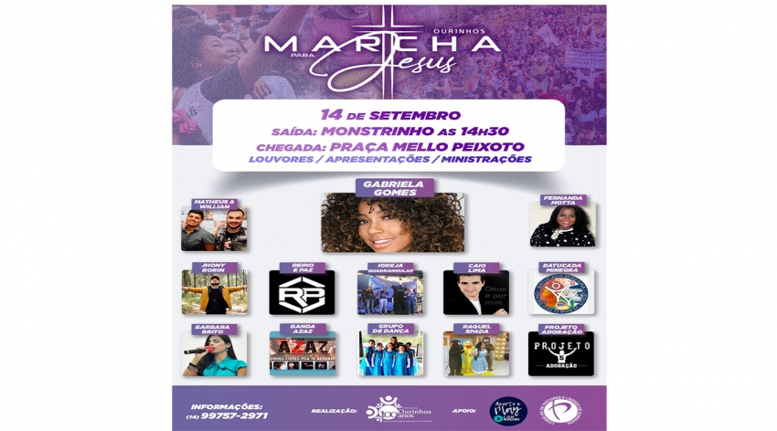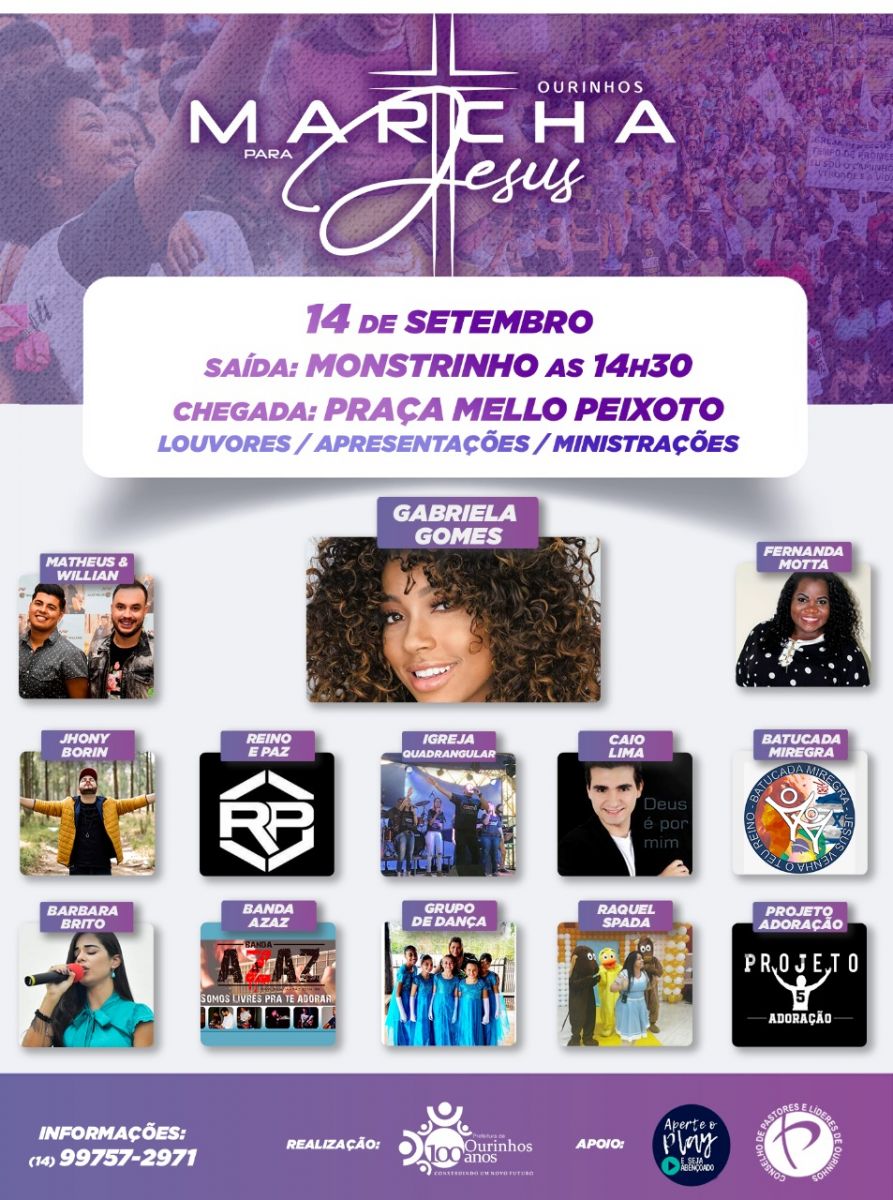 A Marcha para Jesus também tem o tem apoio do Aperte o Play, do Seja Abençoado e do Conselho de Pastores e Líderes de Ourinhos. Para mais informações, o número de contato é o (14) 99757-2971.