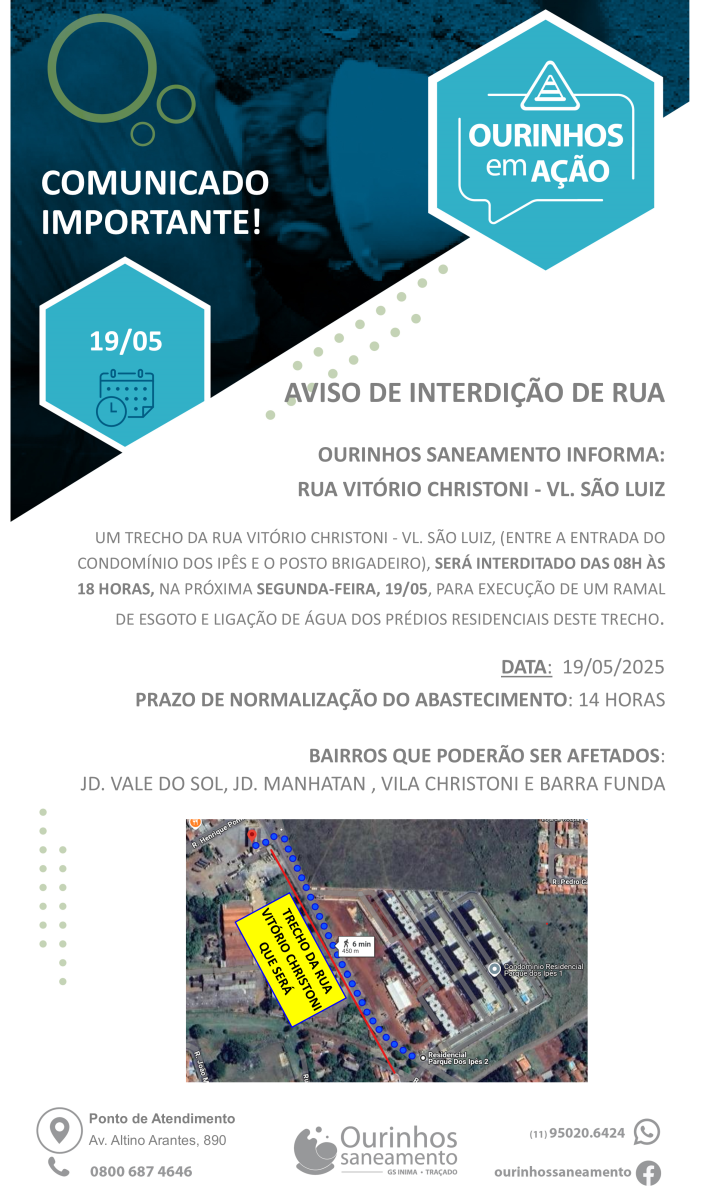 A Ourinhos Saneamento informou que realizará uma manutenção programada na próxima segunda-feira, 19 de maio, com a interdição da Rua Prof. Vitório Christoni, na Vila São Luiz, entre o Condomínio dos Ipês e o Posto Brigadeiro, das 8h às 18h. A ação inclui a execução de um ramal de esgoto e a ligação de água de prédios residenciais.