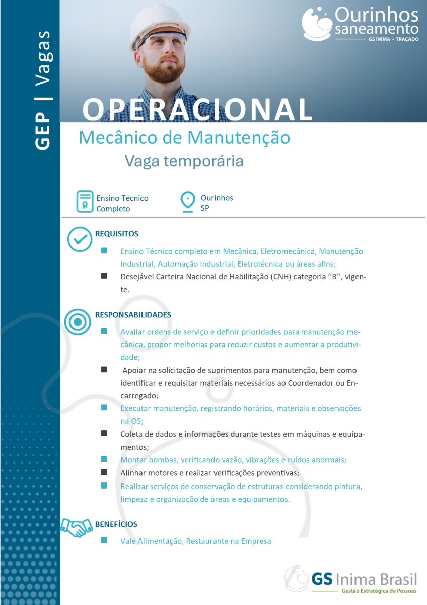 As vagas abertas contemplam os cargos de Técnico em Segurança do Trabalho e Mecânico de Manutenção, oferecendo a oportunidade de integrar uma empresa comprometida com o desenvolvimento do município.